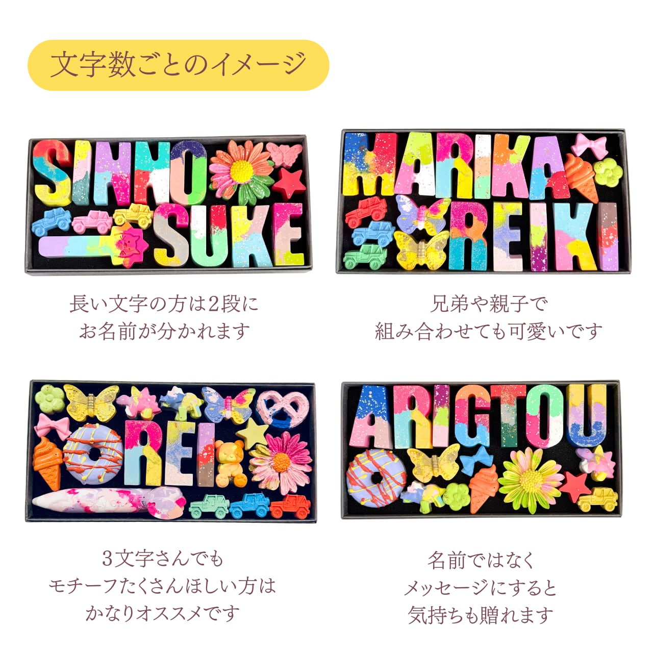 敢えて文字を少なくしてモチーフクレヨンのボックスにするもの可愛いです。